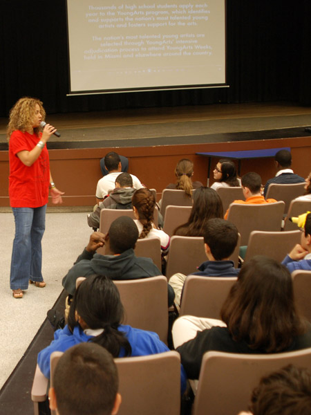 As part of my Project RISE campaign to encourage talented to students to pursue scholarships and careers in the arts, I arranged for a presenter from YoungARTS to come speak to a select group of students. Individuals were nominated by their visual, literary or performing arts teachers. |